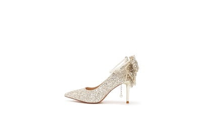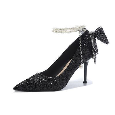 パールチェーンリボン女性ハイヒールウェディングシューズ