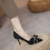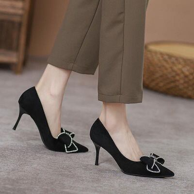 【3日以内出荷】パンプス 細ヒールハイヒール夏の本革新韓国版リボンスパイクシングルシューズ黒のソフトソールワークシューズ レディース 韓国ファッション