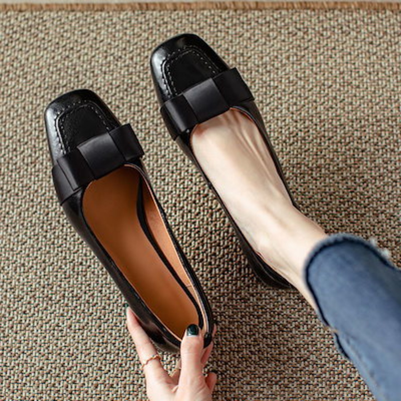 美脚 ポインテッドトゥ 高見えデザイン レトロ スクエアトゥ リボン付き ローヒール パンプス