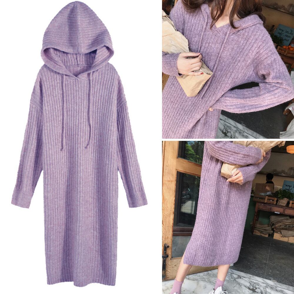 【日本倉庫即納】 リブニットワンピース レディース 秋冬 ミモレ丈 パーカーワンピ ストレッチ