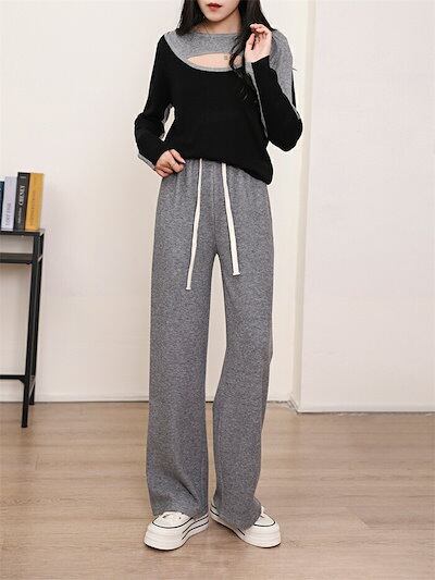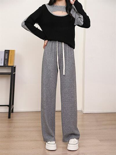 ストレートパンツ 秋冬 ガウチョパンツ パンツ レディース ロングパンツ ニット パンツ ニットパンツ ワイドパンツ ロング丈 秋物 ウェストゴム 体型カバー リボン付き ニットワイドパンツ 長ズボン
