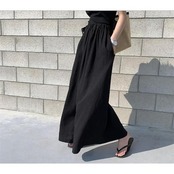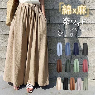 高級な質感 ワイドパンツ 綿麻風 レディース リネン ガウチョパンツ ロングパンツ ボトムス ウエストゴム リボン 無地 体型カバー すっきり 細見え 着痩せ