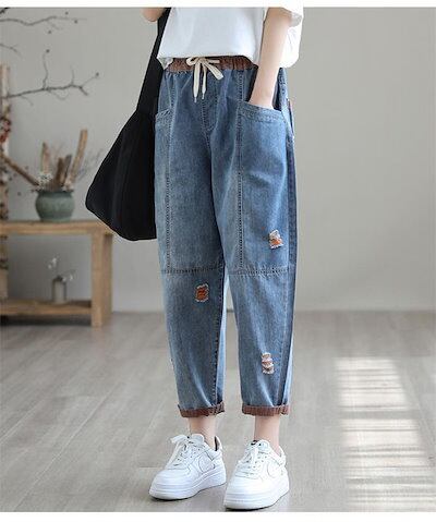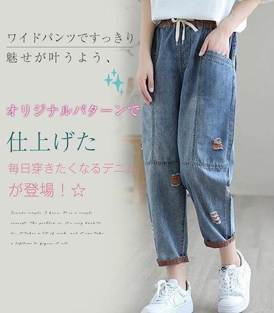 デニムパンツ 春 レディース テーパードパンツ ワイド ボトムス チノパン ジーパン ロールアップ 森ガール 春 無地 ズボン ウエストゴム 大きいサイズ 柔らかい ゆったり 体型カバー 薄手 オシャ