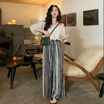 3日以内出荷ワイドパンツかっこいいスラックスパンツ ワイドパンツ レディース のレトロなストライプを結び付けたハイウエストのオーバーサイズのゆったりストレートモップパンツ韓国ファッション