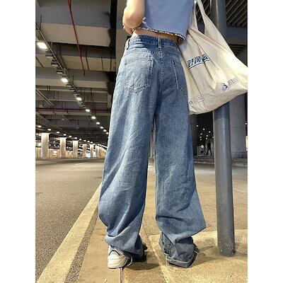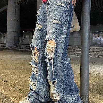 8月追加大人気レディー ハイウエスト ゆったり ストレートパンツ ワイドパンツ 大きいサイズ ダメージジーンズ