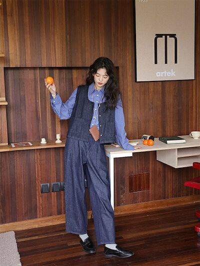 セットアップ レディース 秋冬 3点セット デニム ベスト 前開き 羽織 シャツ 長袖 トップス 折襟 チェック柄 パンツ ボトムス ワイドパンツ デニムパンツ 無地 大きいサイズ ゆったり 体型カバ