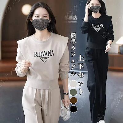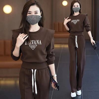 2025春新作 カジュアルセットアップ レディース 韓国ファッション デザイン感トップス 着痩せ二点セット/ワイドパンツス+長袖スウェット上下セット/無地/大きいサイズ 体型カバー