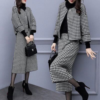 大きいサイズ レディース ツイードセットアップ チドリ柄 ノーカラージャケット ワイドパンツ L L
