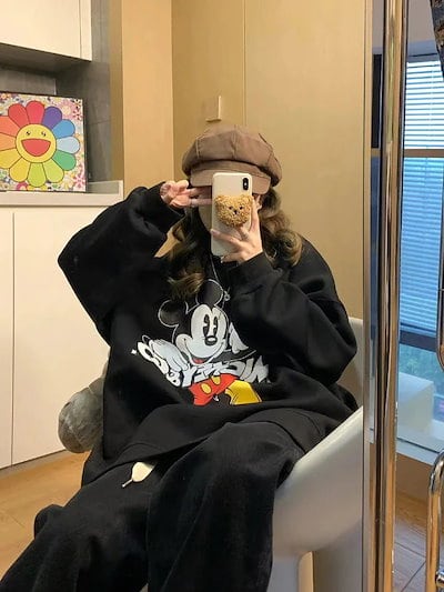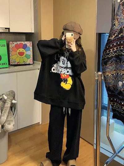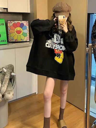 2025新品入荷激安ゆったりミッキープリント長袖ラージバージョンミドル丈スウェットシャツフード付きスウェットシャツ
