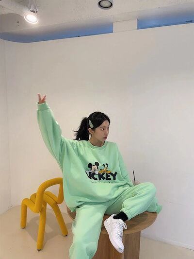 2025新品入荷激安フリース トレーナー スーツ レディース ミッキー プリント ラウンドネック カジュアル トップス ワイドレッグ スポーツ スウェットパンツ 2点セット フード付き ト