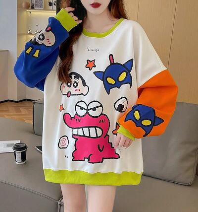 2025新品入荷激安クレヨンしんちゃん 怪獣コットンセーター レディース ミドル丈 老化防止 怠惰なトップ フード付きセーター