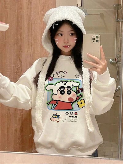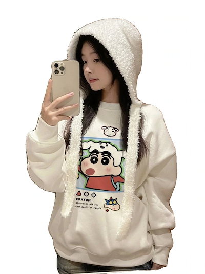 2025新品入荷激安クレヨンしんちゃん プリント ラウンドネック トレーナー レディース ゆったり 万能 長袖 トップス フード付き スウェットシャツ