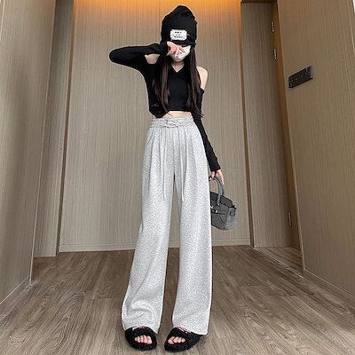 2024年春秋新作ハイウエストドレープストレートルーズトウ グレーワイドパンツ レディースパンツ グランドカジュアルスポーツパンツ