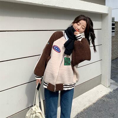 人気ボアアウター 秋アウター ブラッシュトップス 秋冬 ボアコート アウター レディース ゆったり 野球ユニフォーム 韓国ファッション 厚手 キルティングアウター