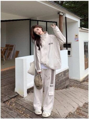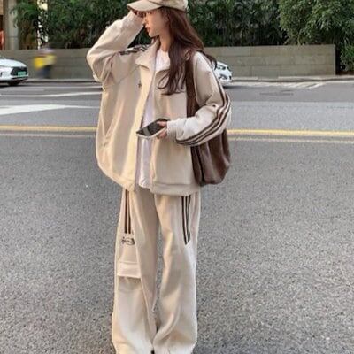 2024 春秋 2点セット トップス お出かけ 羽織り ショート丈 セットアップフルパーカーラウンドヘムルーズ サイド上下ボトムス ストレート系冬 ゆったりサイズワイドシルエットリラックストラック
