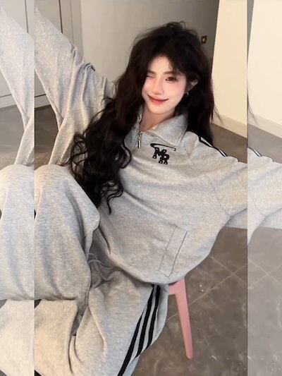 2024 秋冬 2点セット トップス 羽織り ショート丈 セットアップフルパーカートレーナーラウンドヘムルーズ サイド上下ボトムスストレート系冬ゆったりサイズワイドシルエットハーフリラックストラック