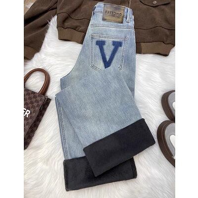 裏起毛パンツ ハイウエストクラッシュカラーデザインワイドレッグジーンズレディース2024秋冬新作ギャザー厚手オーバーサイズゆったりストレートパンツ