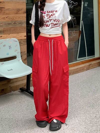 2024春夏パンツ ロング丈 サイドポケット ウエストゴム ワイド ストレート ハイウエスト 美脚効果 脚長効果 細見え 夏 白 黒 緑 赤 おしゃれ かわいい 韓国ファッション レディース お出かけ
