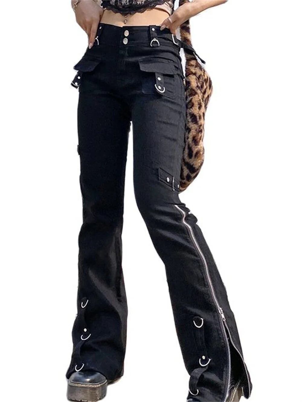女性用パンクリベットジッパージーンズ,ブラック,カーゴパンツy2k,コレクティブウェアスタイル,ゴシック,女性用サイバーコレクティブバックル,90年代の新モデル y2k ボトムス T240901121835_02