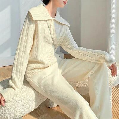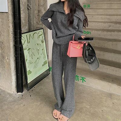 ニット セットアップ パンツ レディース 長袖 タートルネック 秋冬 おしゃれ セーター ニットセーター ケーブル編み ニットパンツ 上下セット ワイドパンツ ワイド ガウチョパンツ プルオーバー ゆ