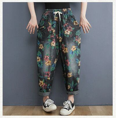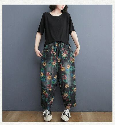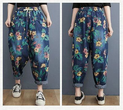 デニムパンツ 大人可愛い パンツ サルエル ワイドパンツ 花柄 ブラック ワイドタックパンツ 切替え 大きいサイズ テーパードデニムパンツ ハイライズデニムパンツ ロング ハイウエスト レディース ボ