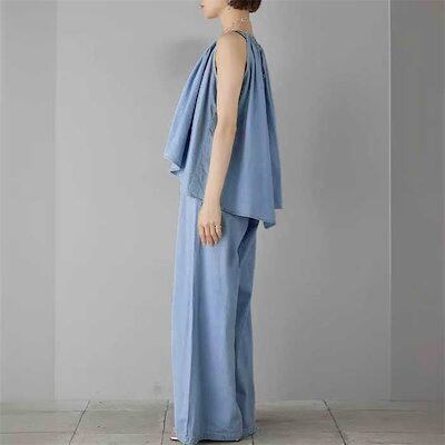 セットアップ パンツセット デニム 新作 キャミソール ワイドパンツ 無地 綿 ロング パンツ ノースリーブ カジュアル ストリート 可愛い お出かけ 旅行 デート 女子会 レディース 春 夏 上下セ