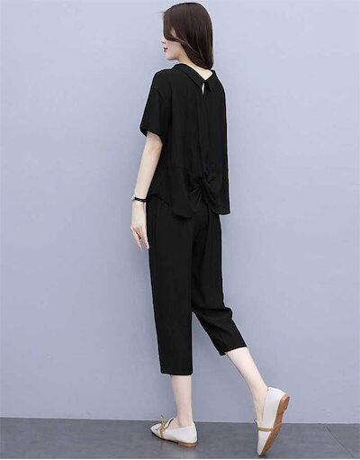 セットアップ 上下セット パンツセット 新作 パンツ 9分丈 紐 シャツ ブラウス 半袖 無地 ワイド 薄手 デザイン感 プルオーバー レディース 体型カバー 着?せ カジュアル シンプル 可愛い ゆ