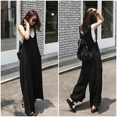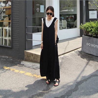 レディース オーバーオール Vネック ノースリーブ ワイドレッグ パンツ 無地 カジュアル 大人可愛い ラフスタイル フェミニン お出かけ デート デイリー ブラック S M L XL