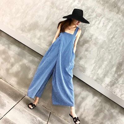 レディース サロペット ストライプ柄 ワイドレッグパンツ アンクルパンツ 半端丈 クロップド オールインワン オーバーオール ボトムス カジュアル 可愛い フェミニン おしゃれ お出かけ 秋