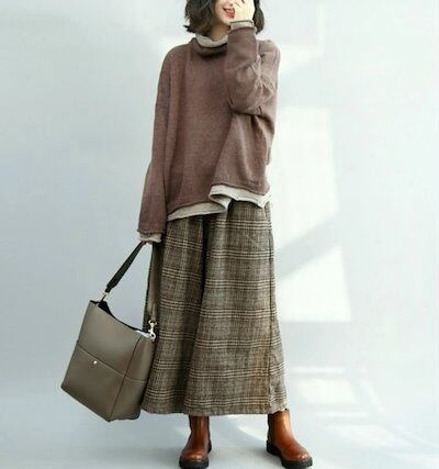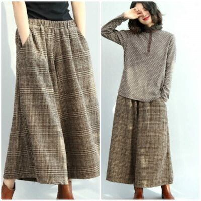 レディース ボトムス チェック ワイド パンツ スカンツ レトロ ウエストゴム 秋冬 カジュアル 大人可愛い ゆったり 休日コーデ お出かけ デート デイリー ブラウン 大きめサイズ フリー