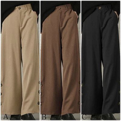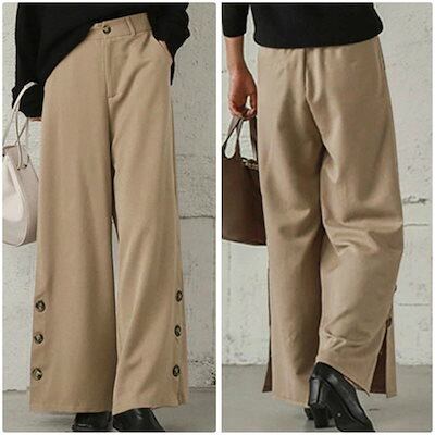 レディース ボトムス ロング パンツ ワイドレッグ 無地 サイドボタン カジュアル シンプル 大人可愛い キレカジ きれいめ ママコーデ 休日コーデ お出かけ デート デイリー ベージュ ブラウ