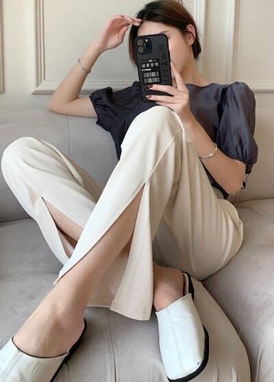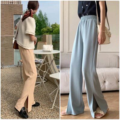 レディース ボトムス ワイド レッグ ロング パンツ 無地 春夏 カジュアル 大人可愛い スリット キレカジ オフィス お出かけ デート デイリー ホワイト ピンク ブラック ブルー XS S M L