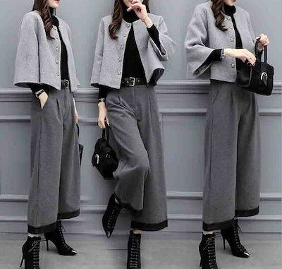 レディース 上下2点セット スーツ ワイドレッグパンツ 襟なしジャケット クロップドパンツ カジュアル フォーマル 可愛い フェミニン きれいめ 上品 エレガント おしゃれ お出かけ オフィス