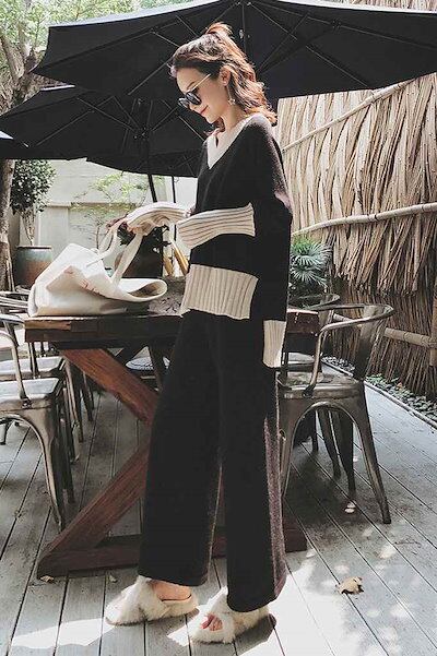 レディース 上下セット Vネック ニット セーター ワイドレッグパンツ カジュアル 可愛い フェミニン きれいめ 上品 エレガント おしゃれ お出かけ オフィス お呼ばれ ブラック M L XL 2X