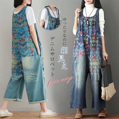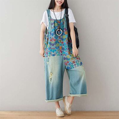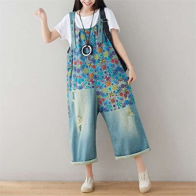オールインワン デニム サロペット レディース オーバーオール ワイドパンツ デニムパンツ ダメージデニム おしゃれ 可愛い 花柄 プリント エスニック ボトムス パンツ 体型カバー オールシーズン