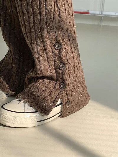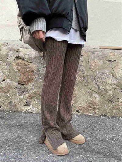 パンツ レディース ボトムス リブニット ケーブル編み フレアパンツ サイドスリット ケーブルニット ロングパンツ ニットパンツ ロング 秋冬 きれいめ ワイドパンツ ハイウェスト フレアニットパンツ