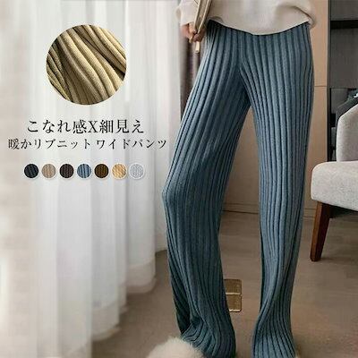 ニットパンツ リブニット ワイドパンツ レディース 春 秋 冬 ロングパンツ ニット素材 長ズボン カジュアル ハイウエスト イージーパンツ ストレートウエストゴムリブ ゆるパンツ フレアパンツリラッ