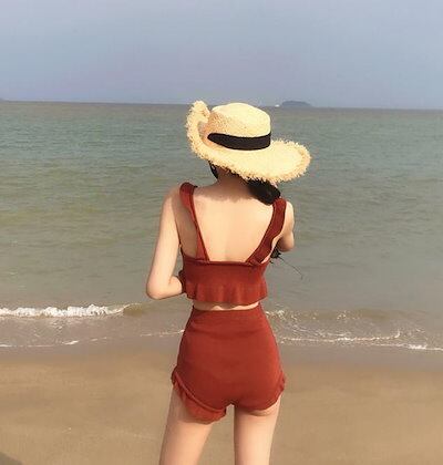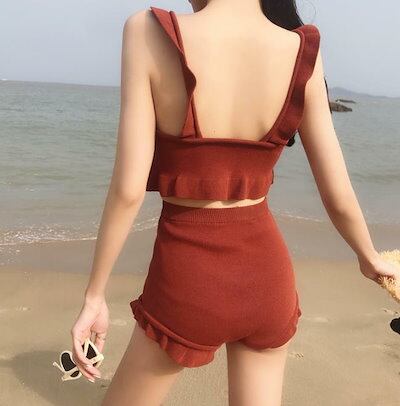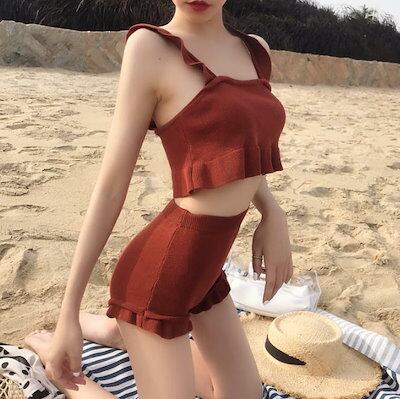 韓国のファッション水着タンキニニットレディースボディカバー薄いフリルハイウエストシンプルな韓国のオル