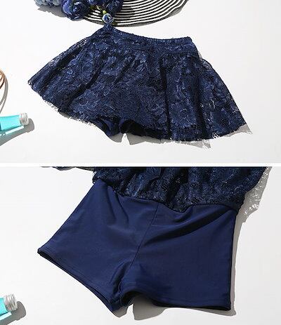 水着 レディース レース ビキニ タンキニ セパレート セット 短パン スリーピース パッド付き 大人可愛い ガーリー ラブリー きれいめ お洒落 透け モテ 体系カバー 黒 青 M L XL 2XL