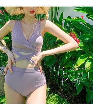 クリスクロス 深めVネック ハイウエスト タンキニ 水着 レディース スイムウェア セパレート パッド付き 胸元開き 谷間魅せ 盛れる 胸下クロス バックリボン 体系カバー くびれ見せ シンプル
