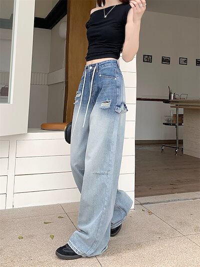 2024春夏パンツ デニム ジーンズ グラデーション ワイド ストレート ハイウエスト 脚長効果 美脚効果 細見え 春 カジュアル おしゃれ かわいい 韓国ファッション レディース お出かけ