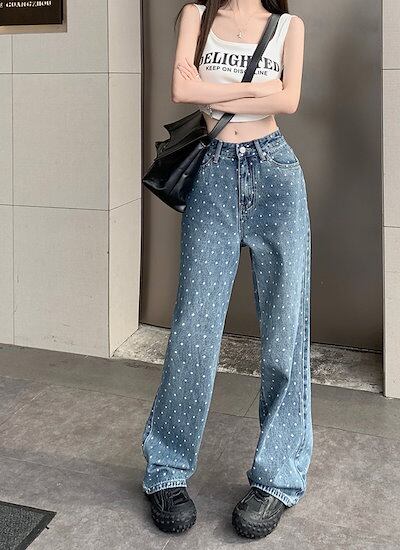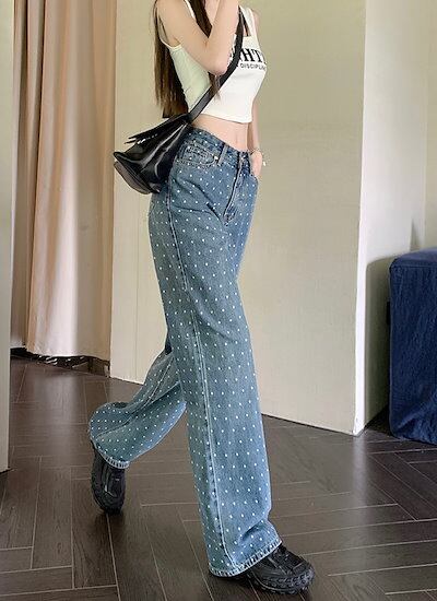 2024春夏パンツ デニム ジーンズ ドット柄 ワイド ストレート ハイウエスト 脚長効果 美脚効果 細見え 春 カジュアル おしゃれ かわいい 韓国ファッション レディース お出かけ