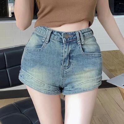 2024 春夏パンツ デニム ジーンズ ショート丈 ホットパンツ ハイウエスト 脚長効果 美脚効果 細見え カジュアル かわいい おしゃれ 春 ウォッシュ加工 韓国ファッション レディース お出かけ