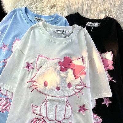 福袋2025韓国ファッション大きいサイズtシャツ もこもこキティちゃん 220g綿 Tシャツ 半袖 S-3XL 3Color レディースキャラクター 夏服