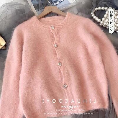 シャギーニットカーディガン レディース 秋 冬 カーディガン ニットカーディガン 毛足長め トップス 羽織り 起毛ニット シャギーニット パールボタン ショート丈 ラウンドネック ふわふわ もこもこ