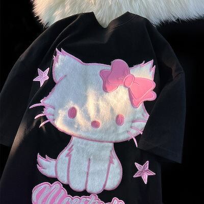 サンリオ韓国ファッション大きいサイズtシャツ もこもこキティちゃん 220g綿 Tシャツ 半袖 S-3XL 3Color レディースキャラクター 夏服