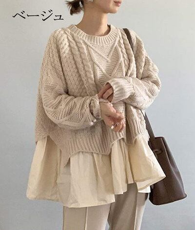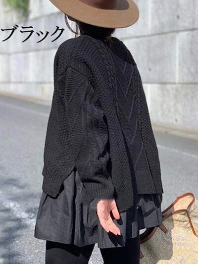 切り替え ニット セーター レディース 長袖 秋冬 ニットセーター レイヤード風 丸首 ケーブル編み 長袖ニット 重ね着 ふんわり ハンカチヘム クルーネックニット 異素材 切替 ドロップショルダー
