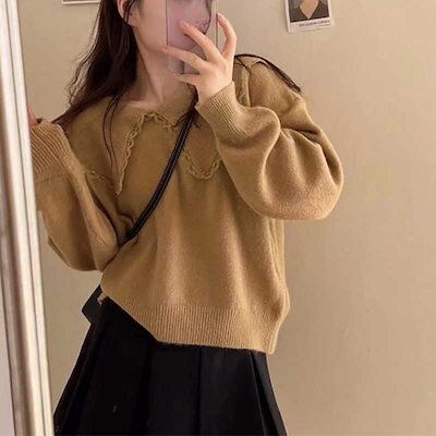 ニット トップス レディース 大きな襟 重ね着 ニットプルオーバー 長袖 ニットセーター 襟付き セーター レース レイヤード プルオーバー 衿付き レース衿 ニットソー 体型カバー インナー 落ち感