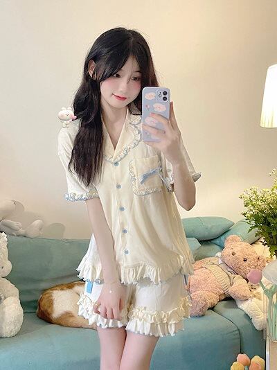 可愛い 春夏 韓国 2023 新入荷 パジャマ レディース ルームウェア パジャマ 半袖+半ズボン 木耳縁 部屋着 2点セット