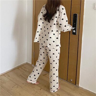 2重ガーゼ パジャマ レディース ルームウェア 秋 冬 春 長袖 部屋着 セットアップ 2点セット 寝間着 寝巻き 上下セット パジャマ 前開き 快適 ガーゼ 大きいサイズ ハート柄 コットン ロング